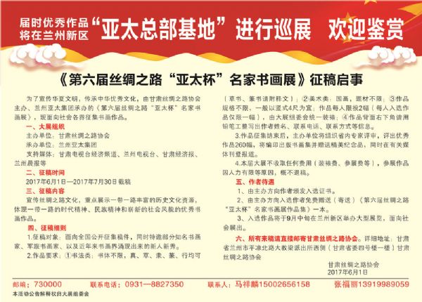 第六屆絲綢之路“亞太杯”名家書畫展征稿啟事優(yōu)秀作品將在蘭州新區(qū)“亞太總部基地”進(jìn)行巡展